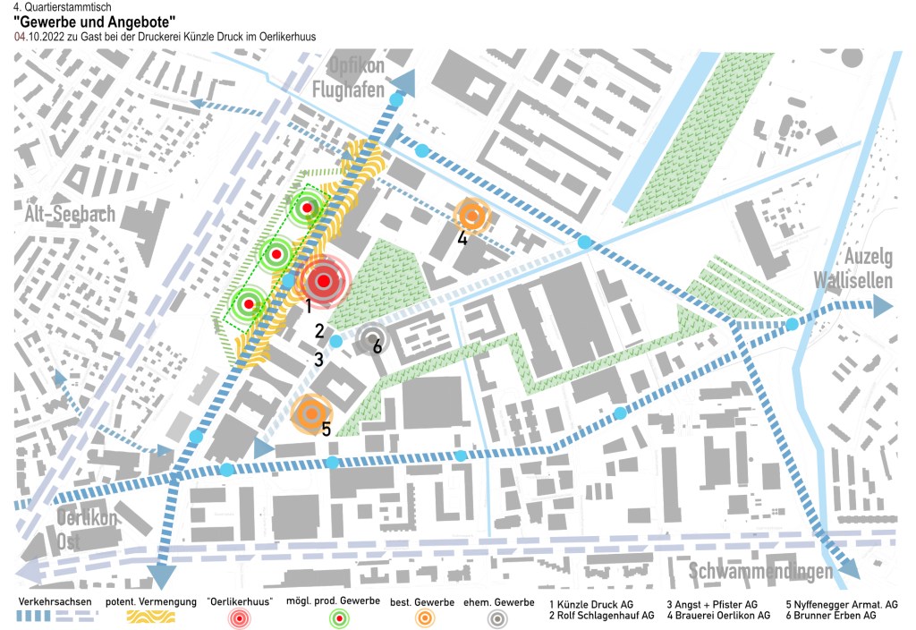 Es wird eingebracht, dass die Stadt von den Eigentümern verlangen könnte Sozio-/Erdgeschossnutzungen einzuplanen; wer solche nicht einplant, müsste zahlen. Dem wird entgegnet, dass im Glattpark von der Gemeinde auch ein überhohes Erdgeschoss verlangt wurde. Nun sind diese zu teuer, viele leer und ansonsten keine öffentlichen / Publikumsnutzungen drin. Gegenvorschlag: Wie könnte man als Private mitbestimmen, ohne planwirtschaftliche Methoden zu bemühen, da ohnehin die Eigentümer:innen Mieterschaft und Nutzungen bestimmen? In der BZO können diese nicht von der Stadt bestimmt werden; ausserdem wird die Stadt das Gewerbe nicht fördern wollen, der letzte Handwerker hat das Parlament verlassen – die Gewerbetreibenden haben die Stadt zum grossen Teil verlassen, darum sind auch die Gewerbevereine am Schrumpfen. Einen gewissen Einfluss auf die Politik hat v.a. noch der städtische Gewerbeverband, der 1-2 Sitzungen jährlich mit der Verwaltung hat. Im Bestand ist es schwierig noch Einfluss zu nehmen, doch bei Neubauprojekten könnte man sich vielleicht einbringen. Eine Handwerkergenossenschaft sollte mit Wohnbaugenossenschaften zusammen Gewerbe in der Thurgauerstrasse realisieren können. Ein Weg, dies zu fordern, könnte der städtische Gewerbeverband sein, ein anderer mit den vernetzten Interessen eine Plattform zu bilden, insbesondere für Gewerbe und Kultur, die ähnliche Interessen haben, aber auch für den Freiraum. Die Plattform sollte eine möglichst pfannenfertige Lösung entwickeln und diese der Stadt präsentieren können. Der Wirtschaftsraum Zürich Nord bringt die entsprechende Forderung in den städtischen Gewerbeverband. So könnte eine neue Identität von Leutschenbach geschaffen werden, die vom Gewerbe mitgeprägt ist.
