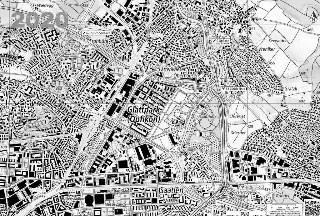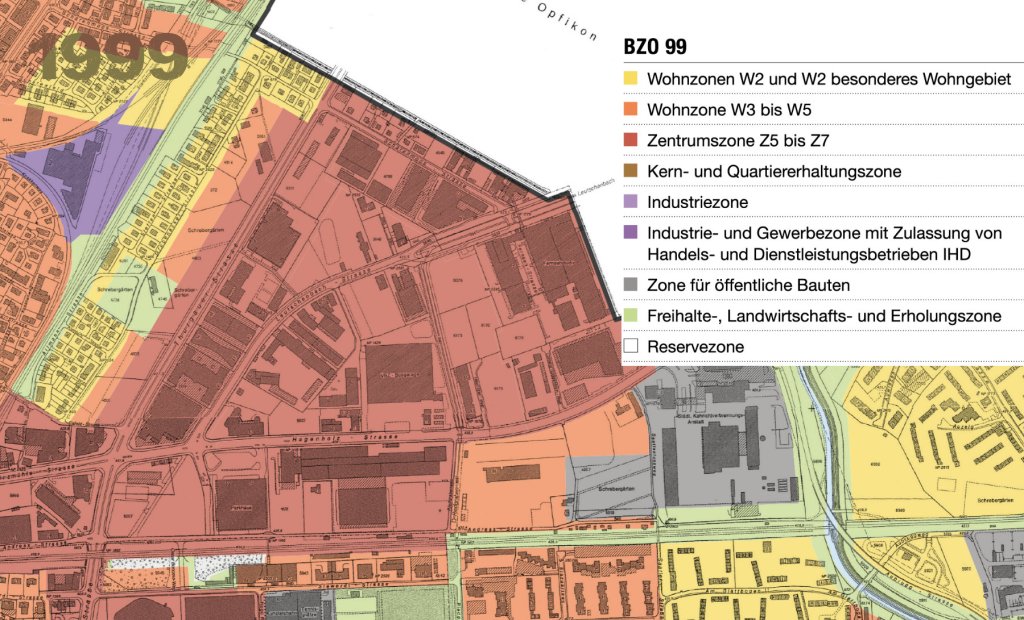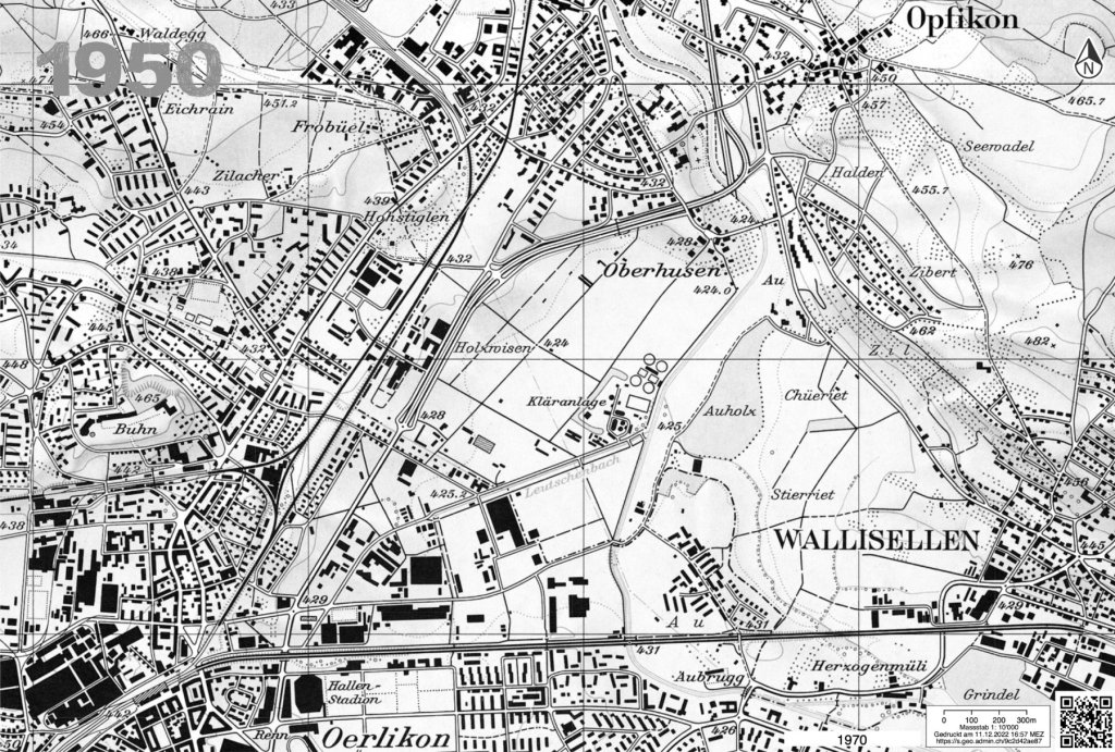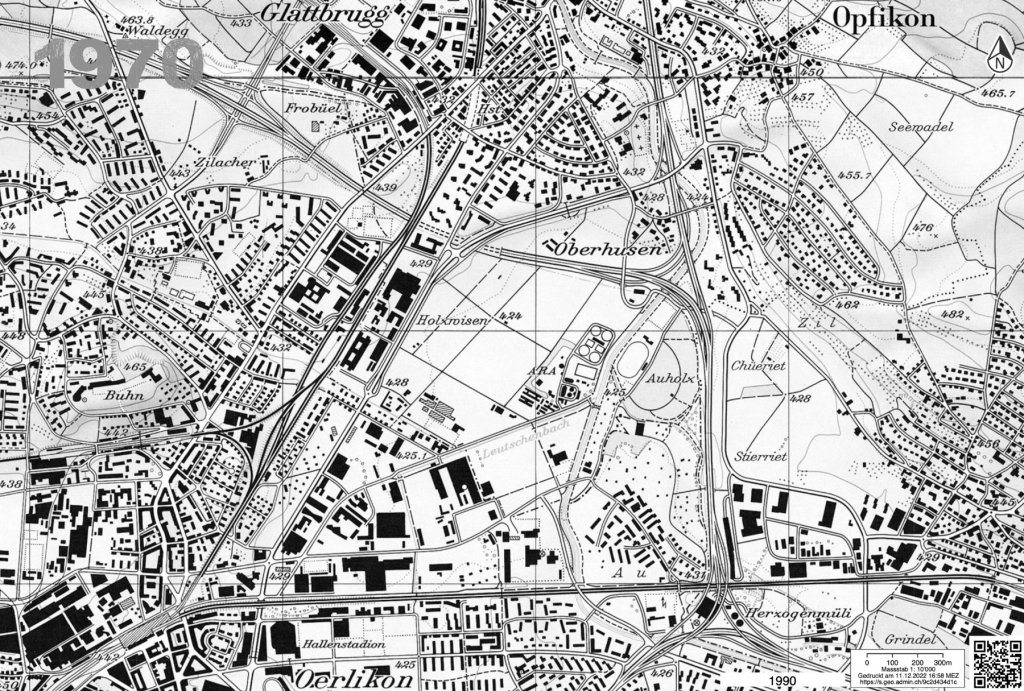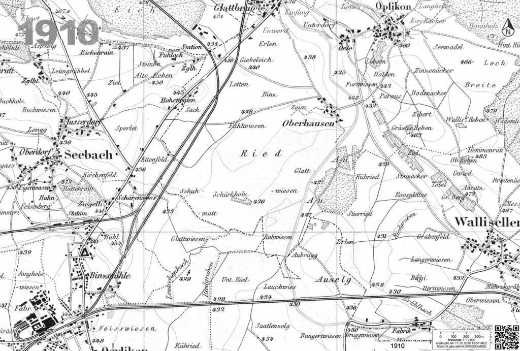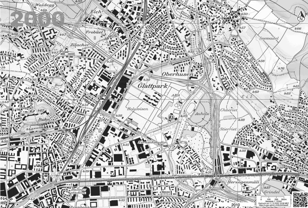 Siedlungsentwicklung der mittleren Glattalstadt seit 1910 und die jeweiligen Zürcher Bau- und Zonenpläne für Leutschenbach (der Ausschnitt der Siedlungsentwicklung ist bewusst grösser gewählt)