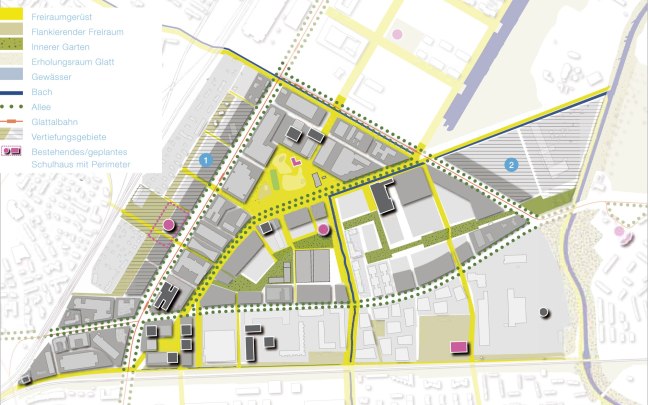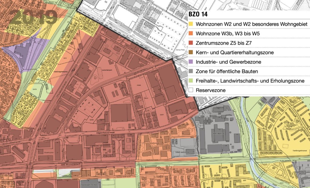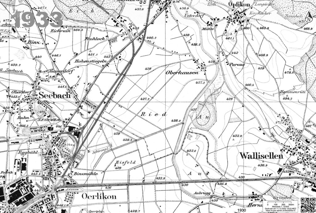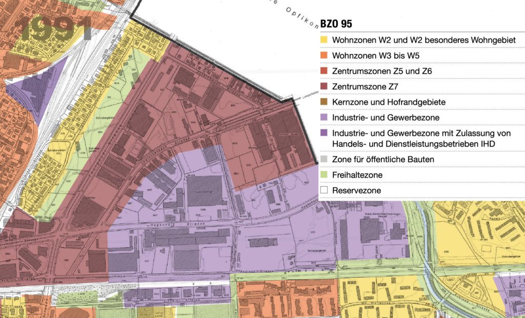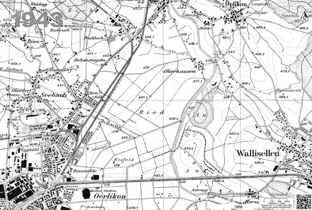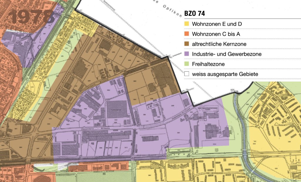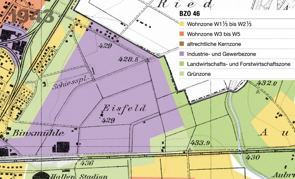 Siedlungsentwicklung der mittleren Glattalstadt seit 1910 und die jeweiligen Zürcher Bau- und Zonenpläne für Leutschenbach (der Ausschnitt der Siedlungsentwicklung ist bewusst grösser gewählt)