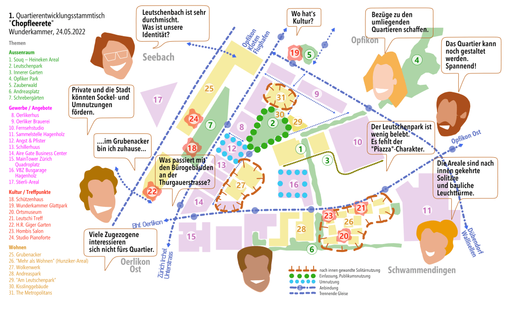 Wenige, dafür umso engagiertere Besucher/innen fanden sich am ersten Quartierentwicklungsstammtisch am Dienstag 24. Mai in der Wunderkammer ein, zur Hälfte in Leutschenbach arbeitende zur anderen hier wohnende, was in etwa die vorgesehene Verteilung in Leutschenbach widerspiegelte.